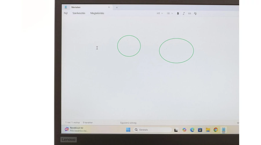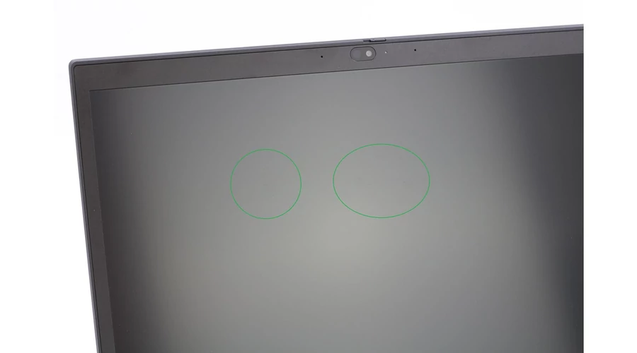 Kijelzőn egy-két tollhegynyi karc és egy kis világos folt, ami fehér háttérnél halványan látszik.